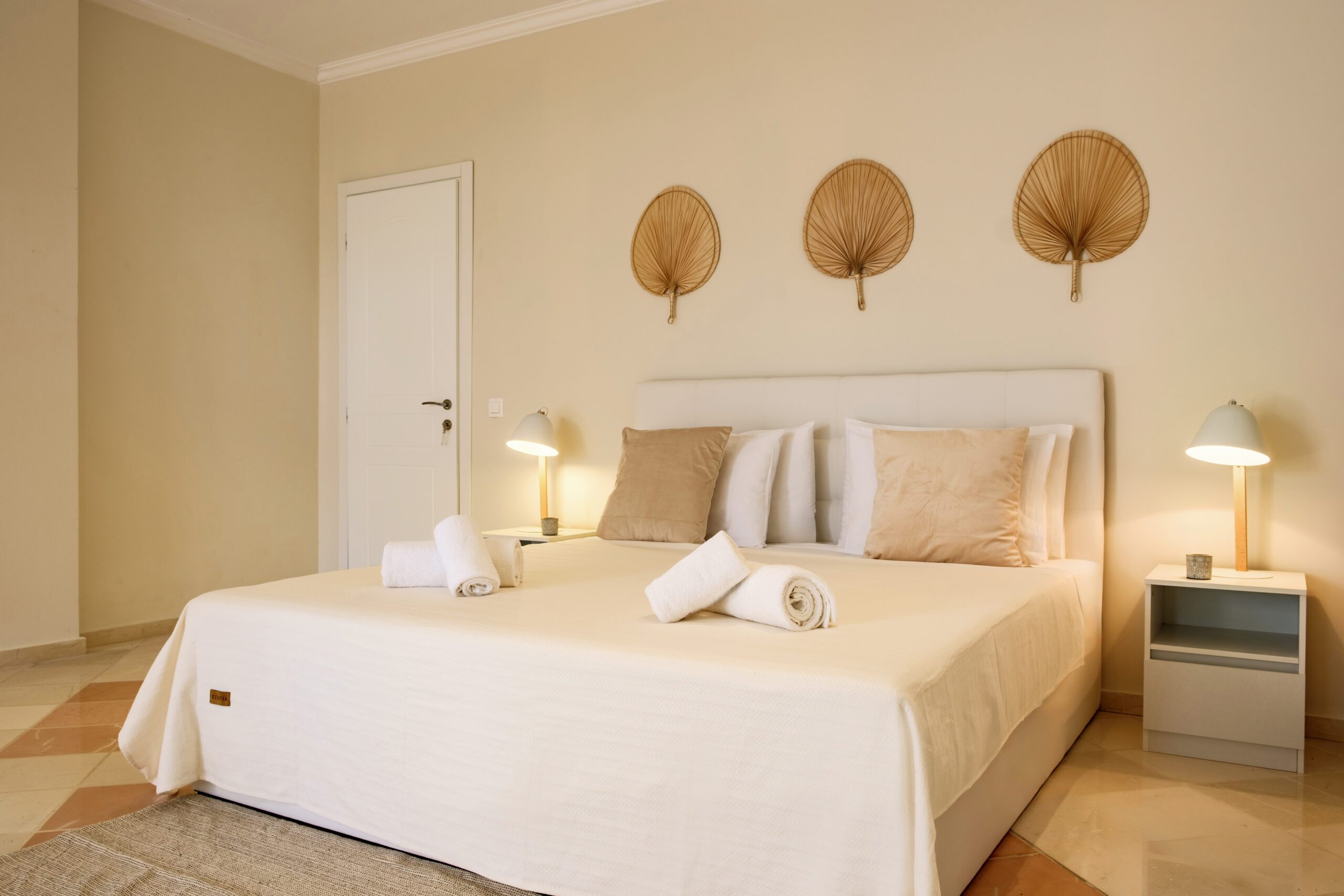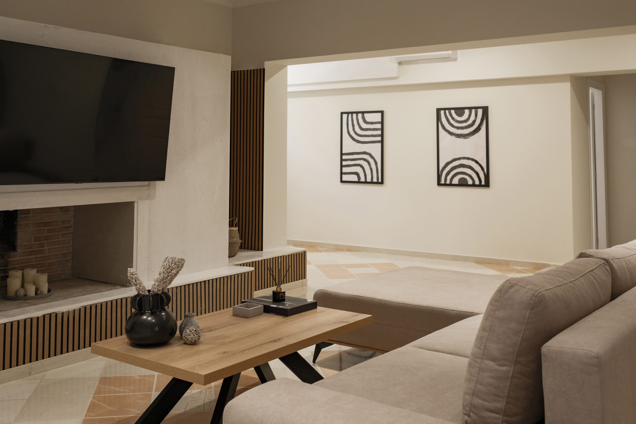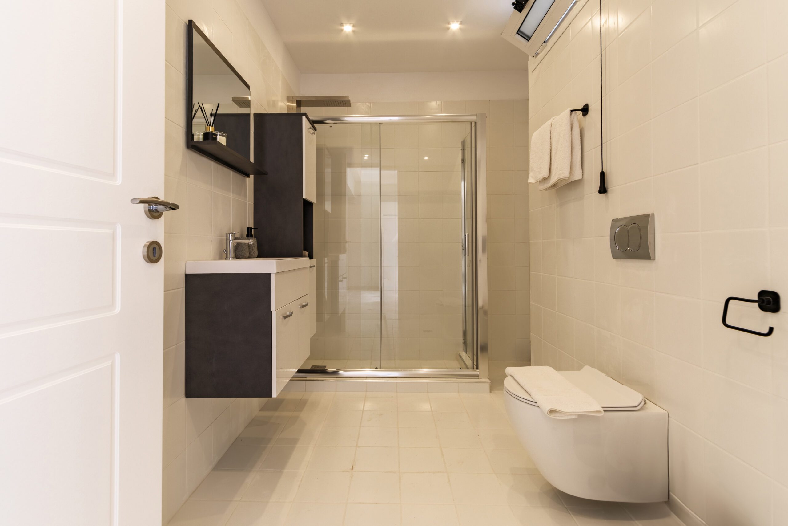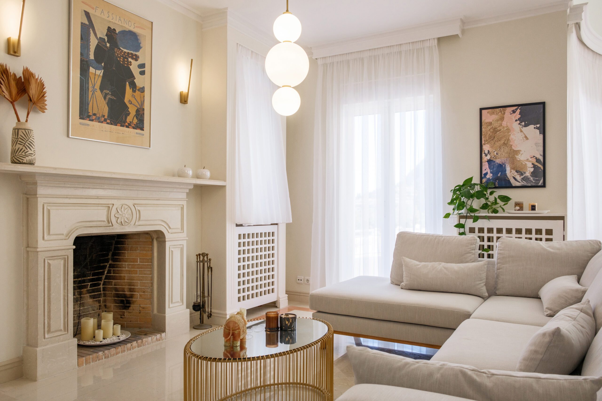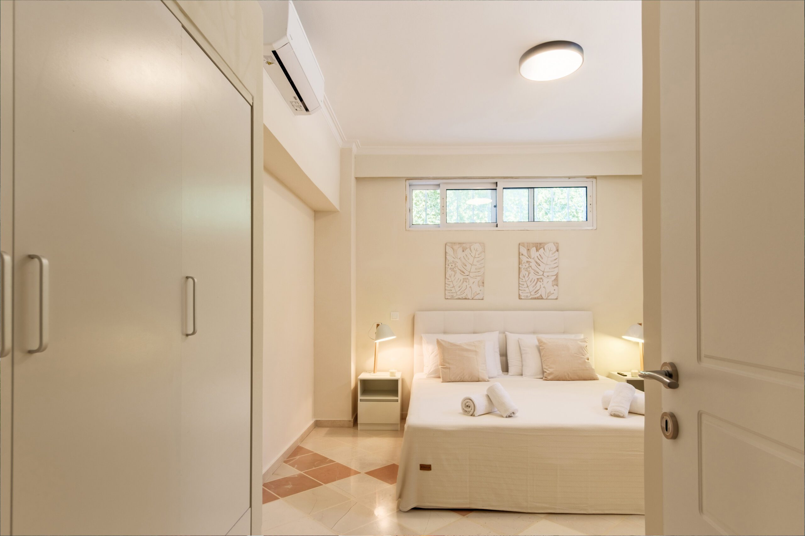 The lower ground floor accommodates four rooms. Three rooms with double beds en-suite bathrooms. One with two single beds en-suite bathroom and a walk-in wardrobe. Also a living room and a kitchen. Both of them have direct access to the garden.